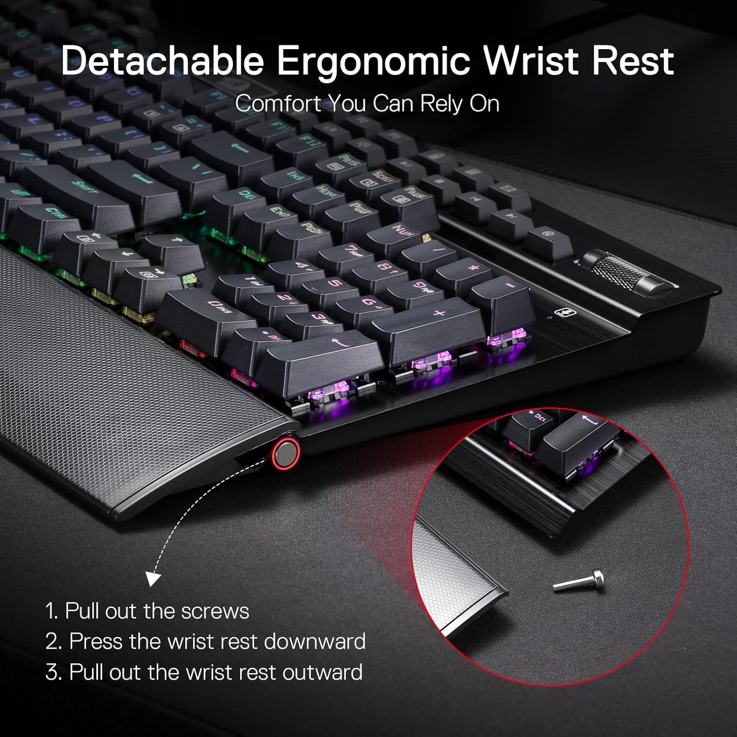 O apoio de pulso removível traz mais conforto em longas sessões, ajudando a reduzir a fadiga e mantendo a ergonomia mesmo em horas seguidas de jogo.